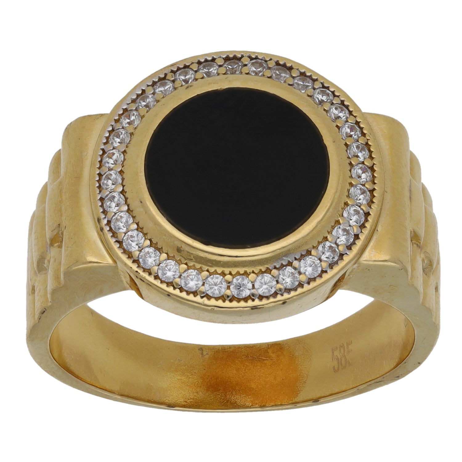 14ct Gold Onyx & Cubic Zirconia Patterned Signet Ring Size T