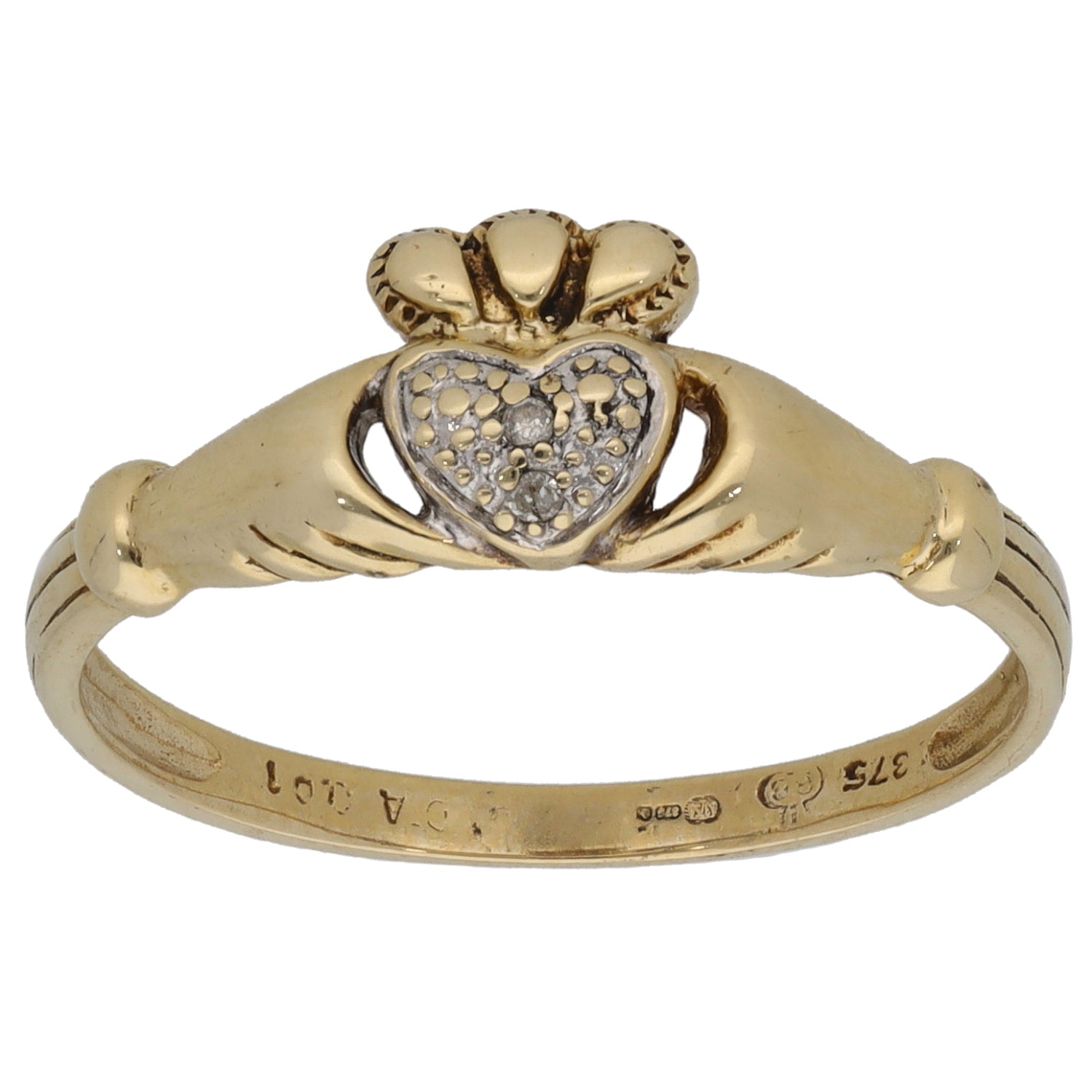 9ct Gold 0.01ct Diamond Claddagh Ring Size Q