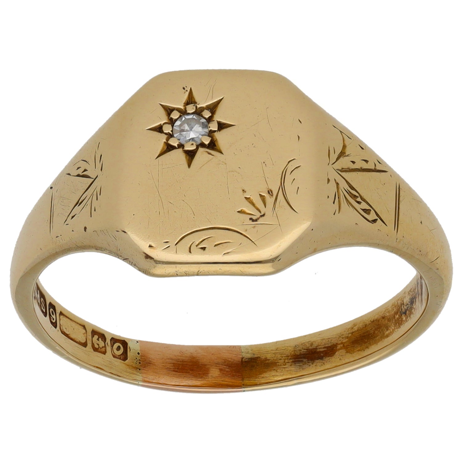 9ct Gold 0.04ct Diamond Single Stone Patterned Signet Ring Size U