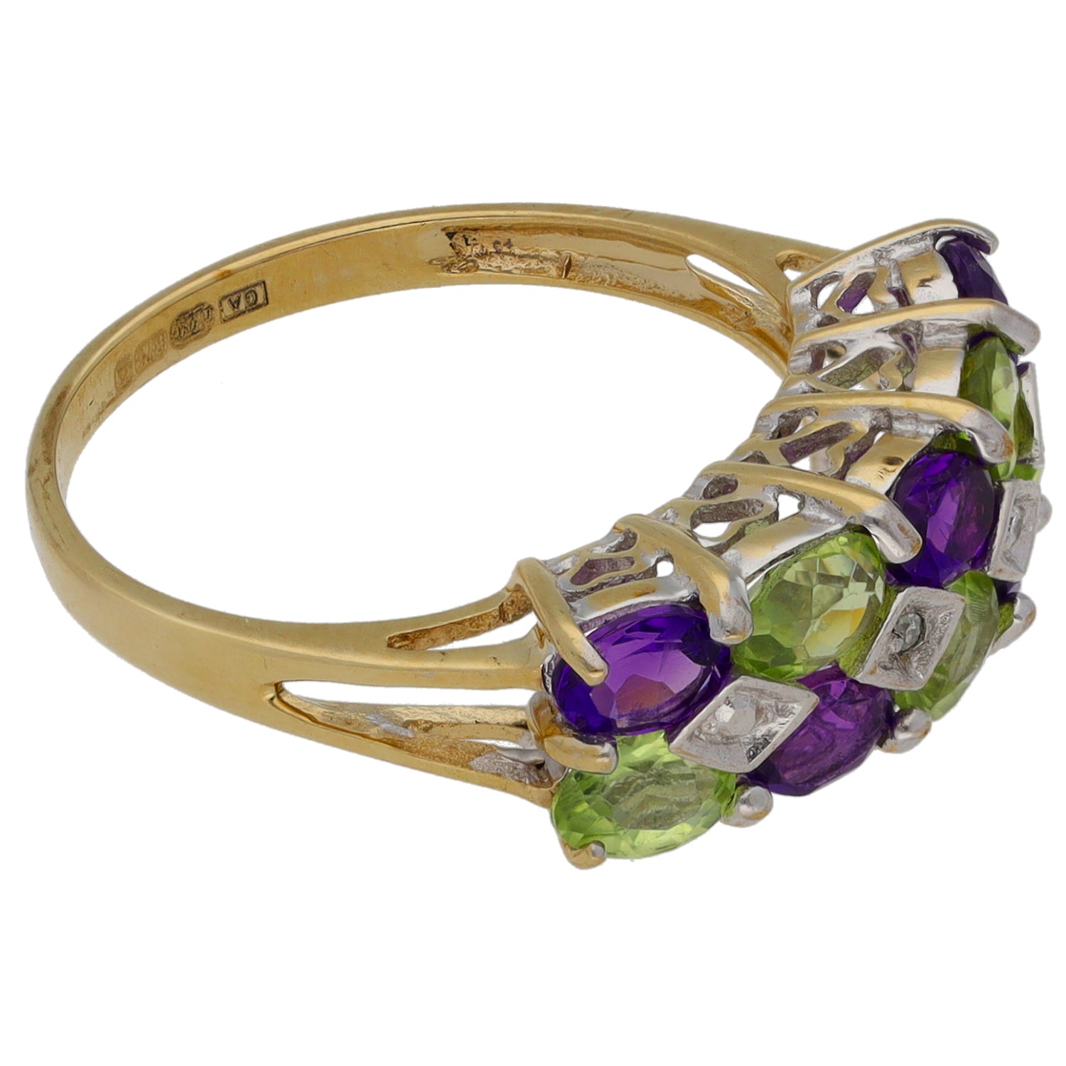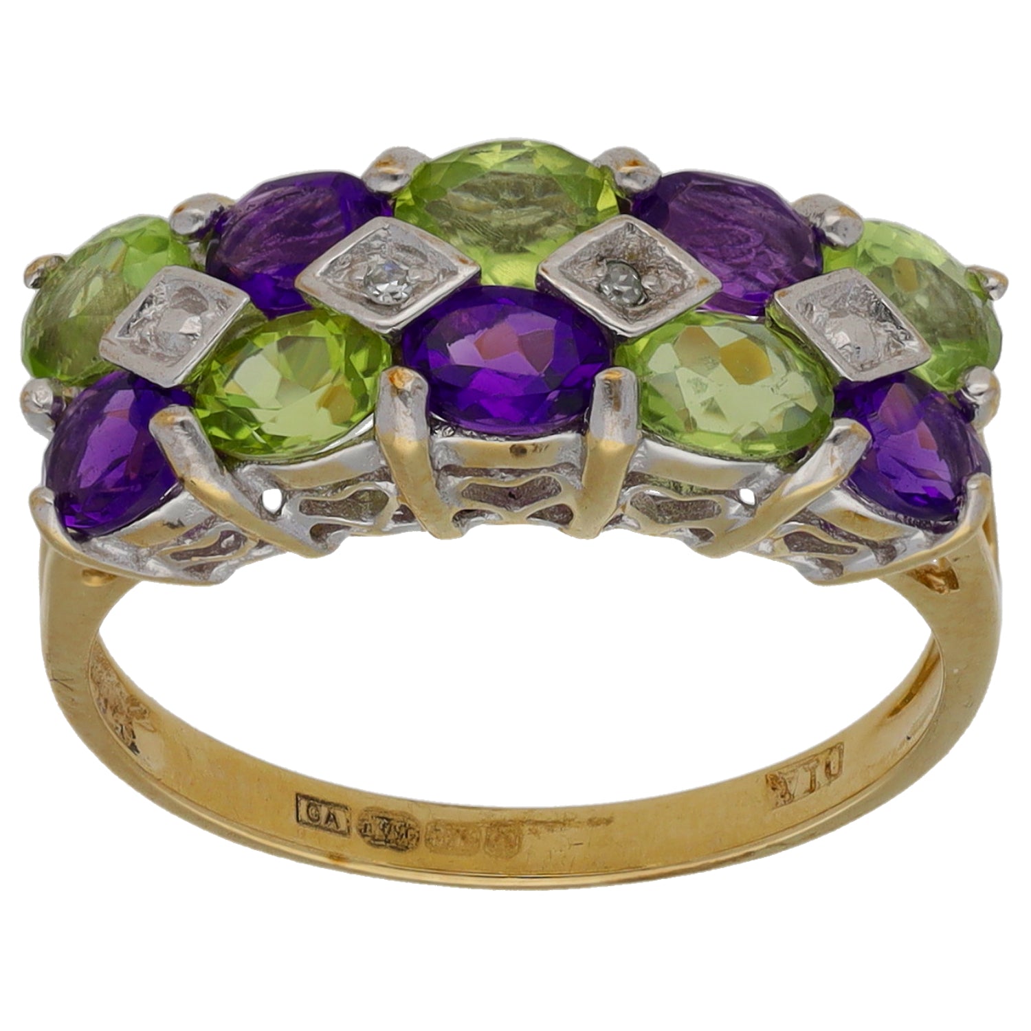9ct Gold Amethyst, Peridot & 0.01ct Diamond Dress/Cocktail Ring Size K