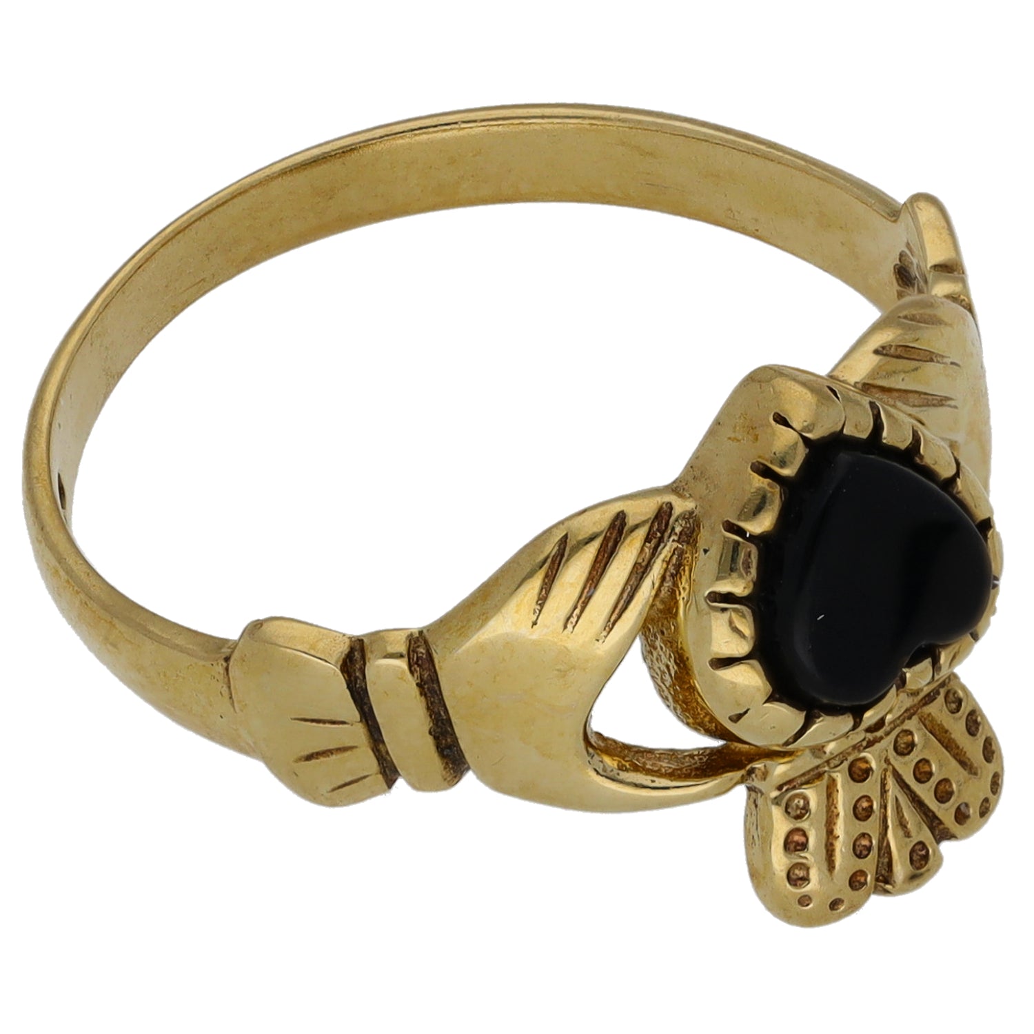 9ct Gold Onyx Single Stone Claddagh Ring Size Q