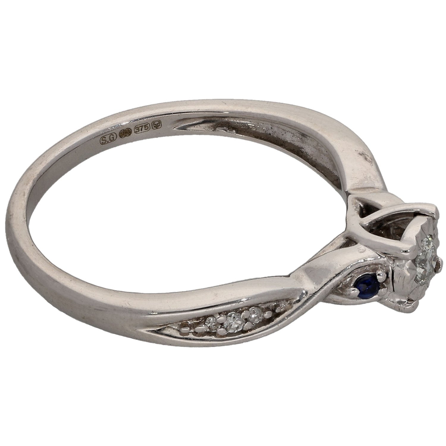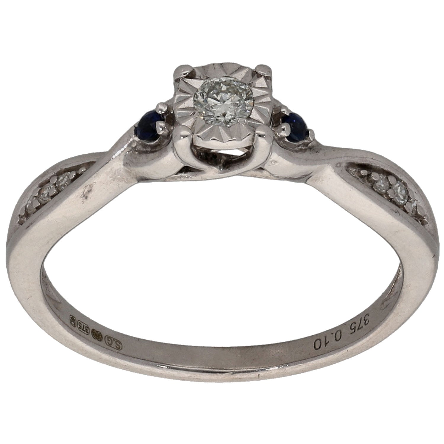 9ct White Gold 0.10ct Diamond & Sapphire Solitaire Ring With Accent Stones Size L