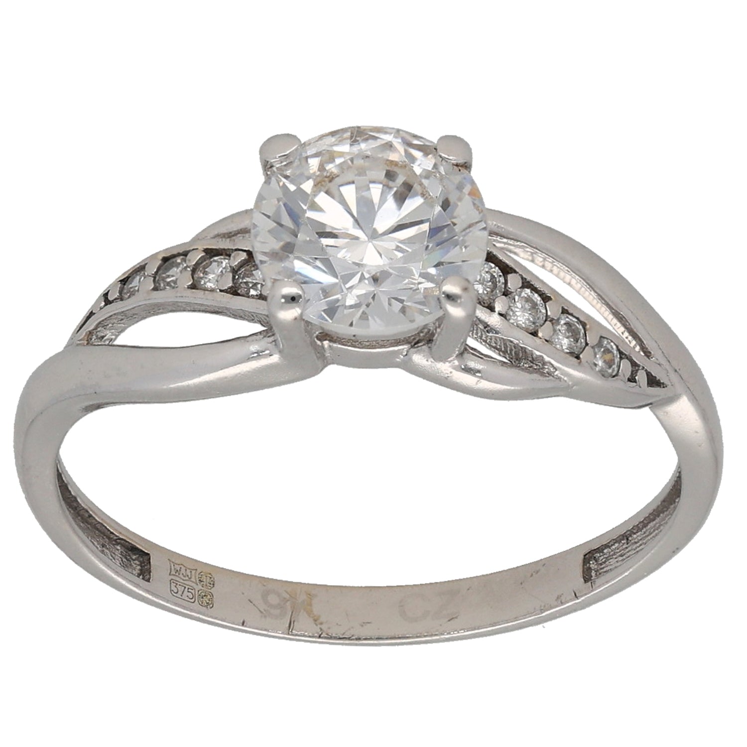 9ct White Gold Cubic Zirconia Single Stone Ring with Accent Stones Size O