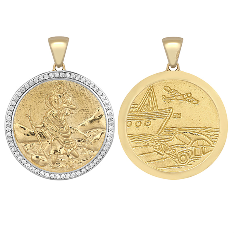 New 9ct Gold Cubic Zirconia Double Sided St Christopher Pendant 33mm