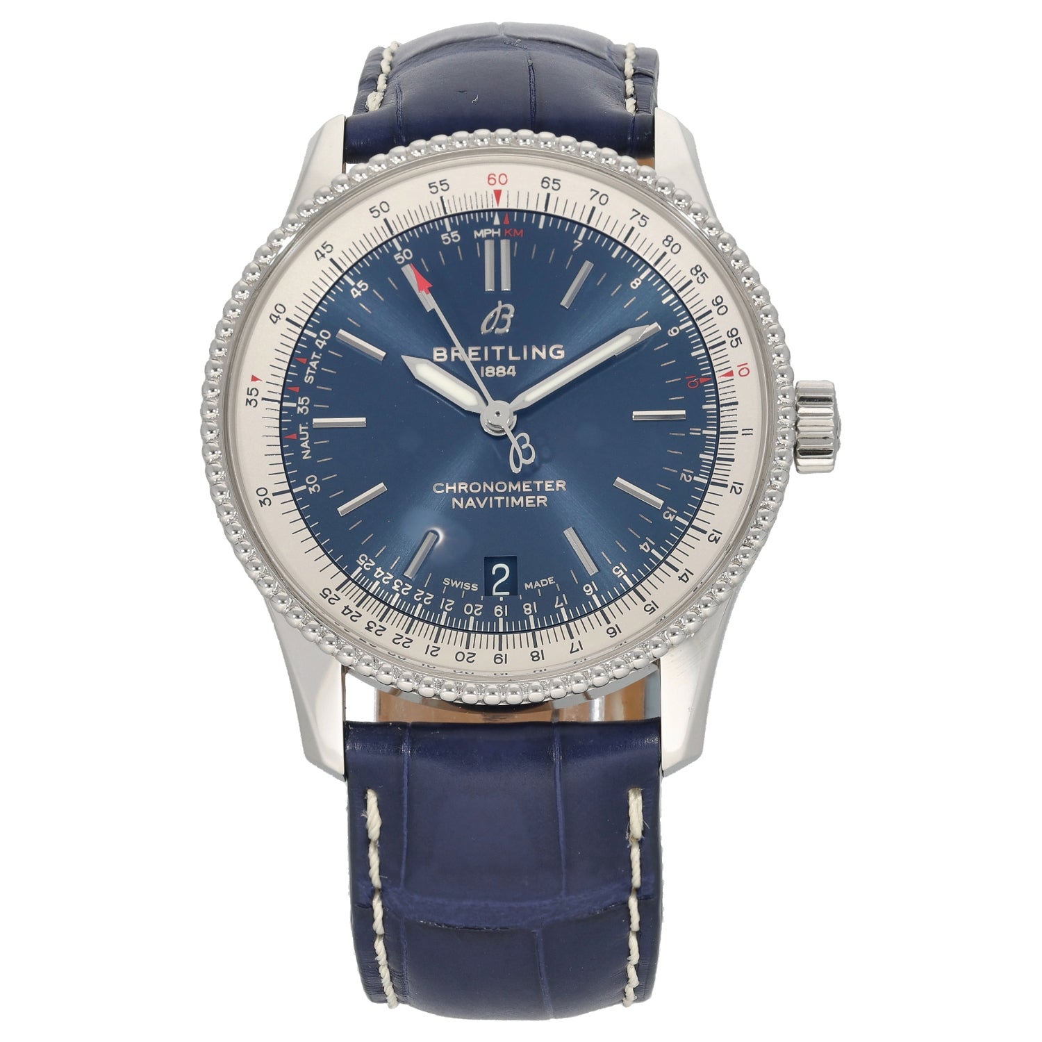 The Breitling Navitimer is an intricate timepiece which was launched by Breitling back in 1969, being a perfect addition to any watch collection. This pre-owned example is finished with a blue dial inside a 38mm stainless steel case, which is fitted on an adjustable leather bracelet. The watch is also powered by an Automatic movement and is water resistant up to 30 metres.