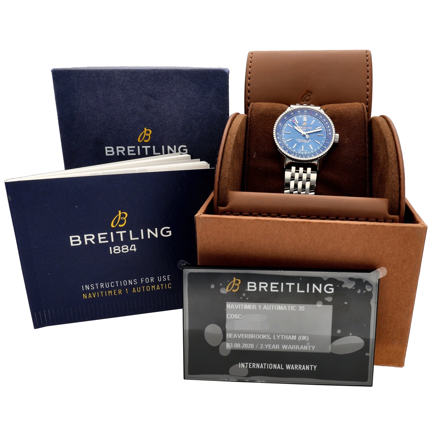 The Breitling Navitimer is an intricate timepiece which was launched by Breitling back in 1969, being a perfect addition to any watch collection. This pre-owned example is finished with a blue dial inside a 35mm stainless steel case, which is fitted on an 18cm stainless steel bracelet. The watch is also powered by an Automatic movement and is water resistant up to 30 metres.