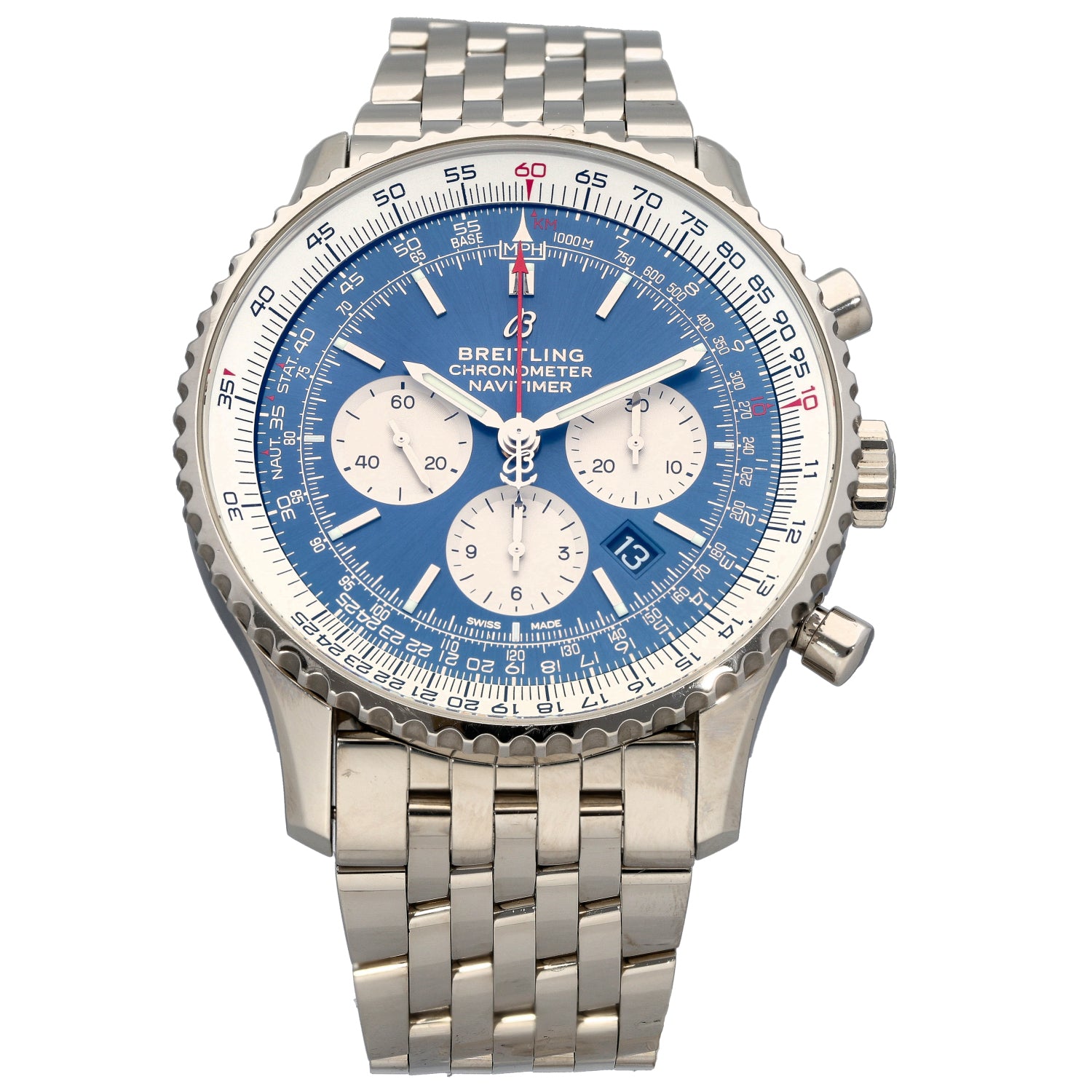 The Breitling Navitimer is an intricate timepiece which was launched by Breitling back in 1969, being a perfect addition to any watch collection. This pre-owned example is finished with a blue dial inside a 46mm stainless steel case, which is fitted on a 22cm stainless steel bracelet....