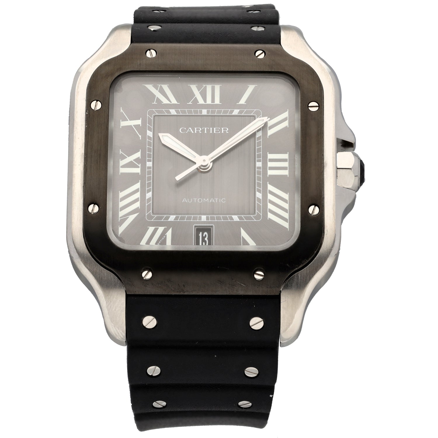 The Cartier Santos is an intricate timepiece which was launched by Cartier back in 1904, being a perfect addition to any watch collection. This pre-owned example is finished with a black dial inside a 39mm stainless steel case, which is fitted on an adjustable rubber bracelet. The watch is also powered by an Automatic movement and is water resistant up to 100 metres.