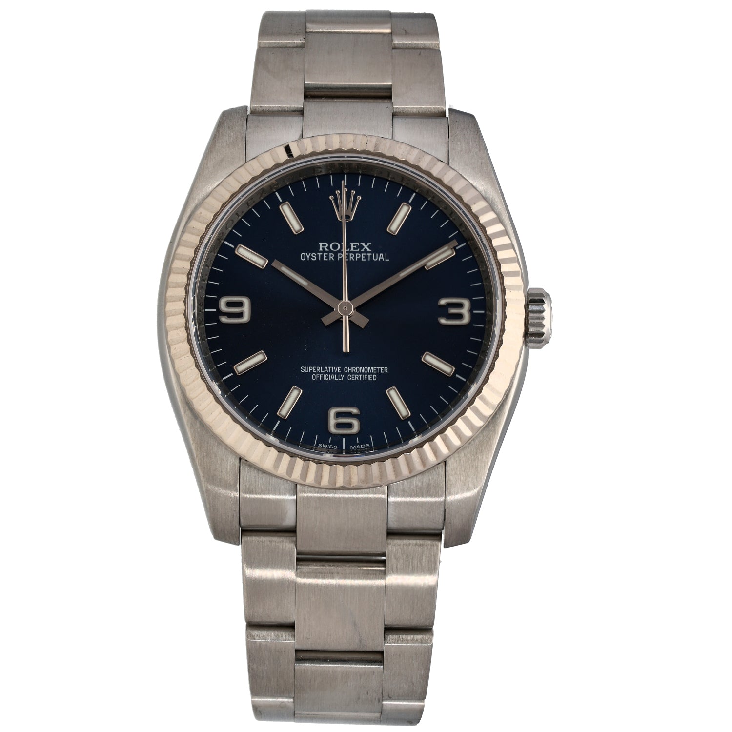 The Rolex Oyster Perpetual is an intricate timepiece which was launched by Rolex back in 1931, being a perfect addition to any watch collection. This pre-owned example is finished with a blue dial inside a 36mm stainless steel case, which is fitted on an 18.5cm stainless steel bracelet. The...