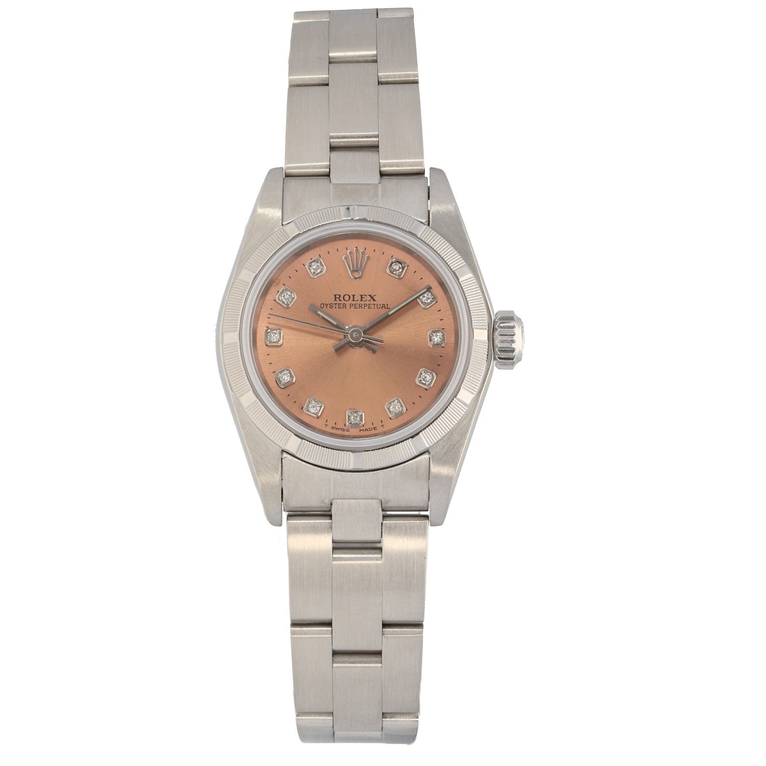 The Rolex Oyster Perpetual is an intricate timepiece which was launched by Rolex back in 1931, being a perfect addition to any watch collection. This pre-owned example is finished with a salmon dial inside a 26mm stainless steel case, which is fitted on a 16.5cm stainless steel bracelet. The...