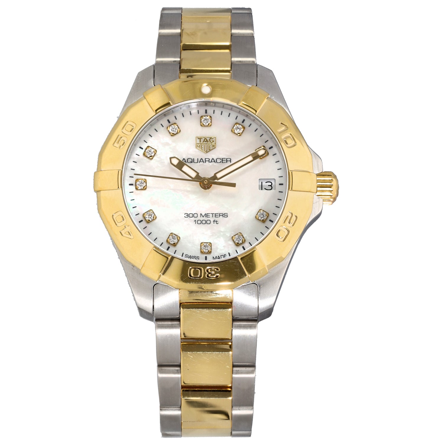 The Tag Heuer Aquaracer is an intricate timepiece which was launched by Tag Heuer back in 2004, being a perfect addition to any watch collection. This pre-owned example is finished with a white Mother of Pearl dial inside a 32mm bi-colour case, which is fitted on a 16.5cm bi-colour bracelet. The watch is also powered by a Quartz movement and is water resistant up to 300 metres.