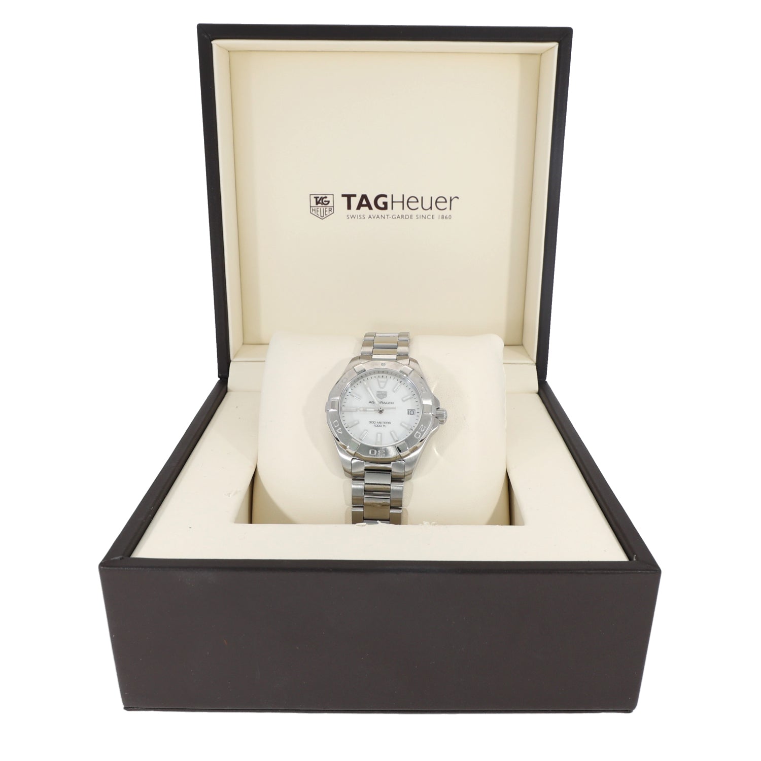 The Tag Heuer Aquaracer is an intricate timepiece which was launched by Tag Heuer back in 2004, being a perfect addition to any watch collection. This pre-owned example is finished with a white Mother of Pearl dial inside a 33mm stainless steel case, which is fitted on a 33mm stainless steel bracelet. The watch is also powered by a Quartz movement and is water resistant up to 300 metres.