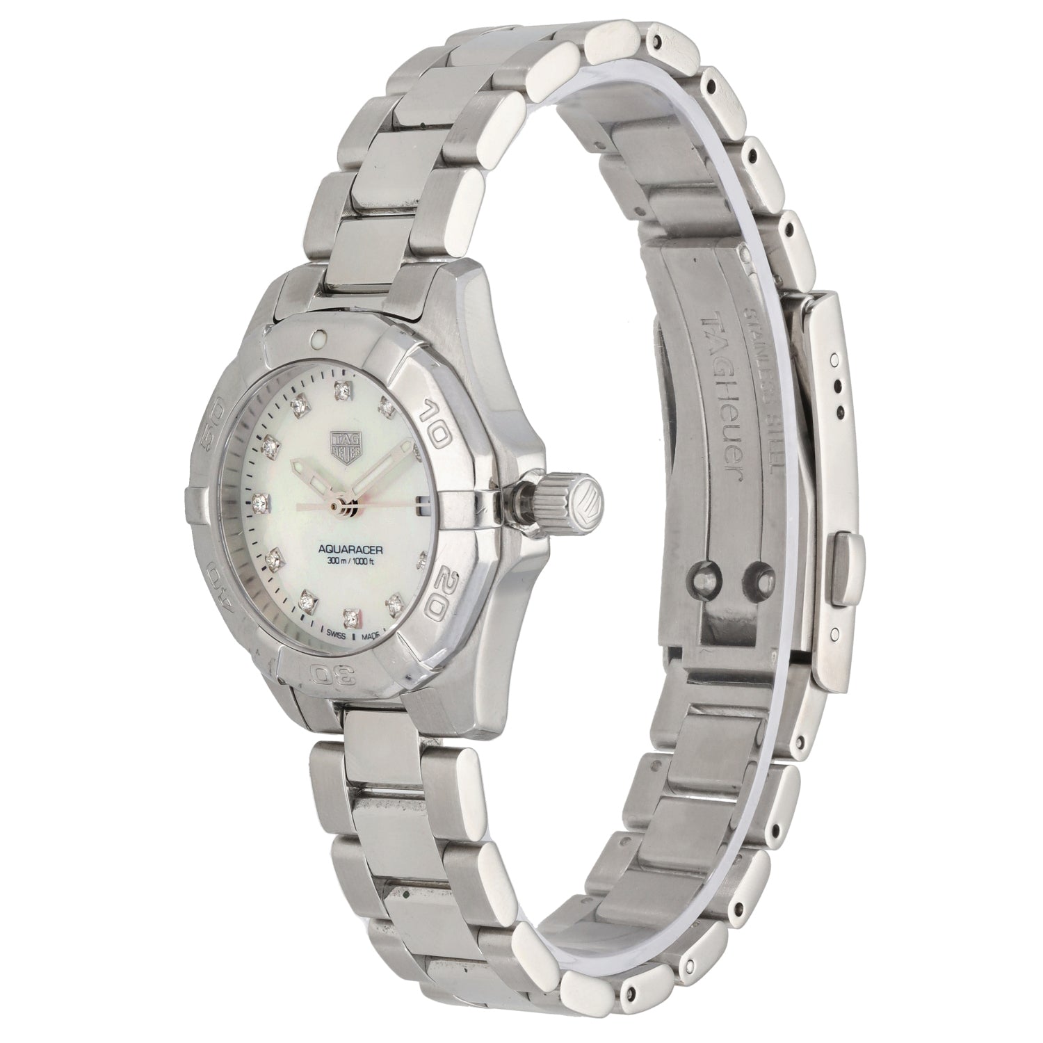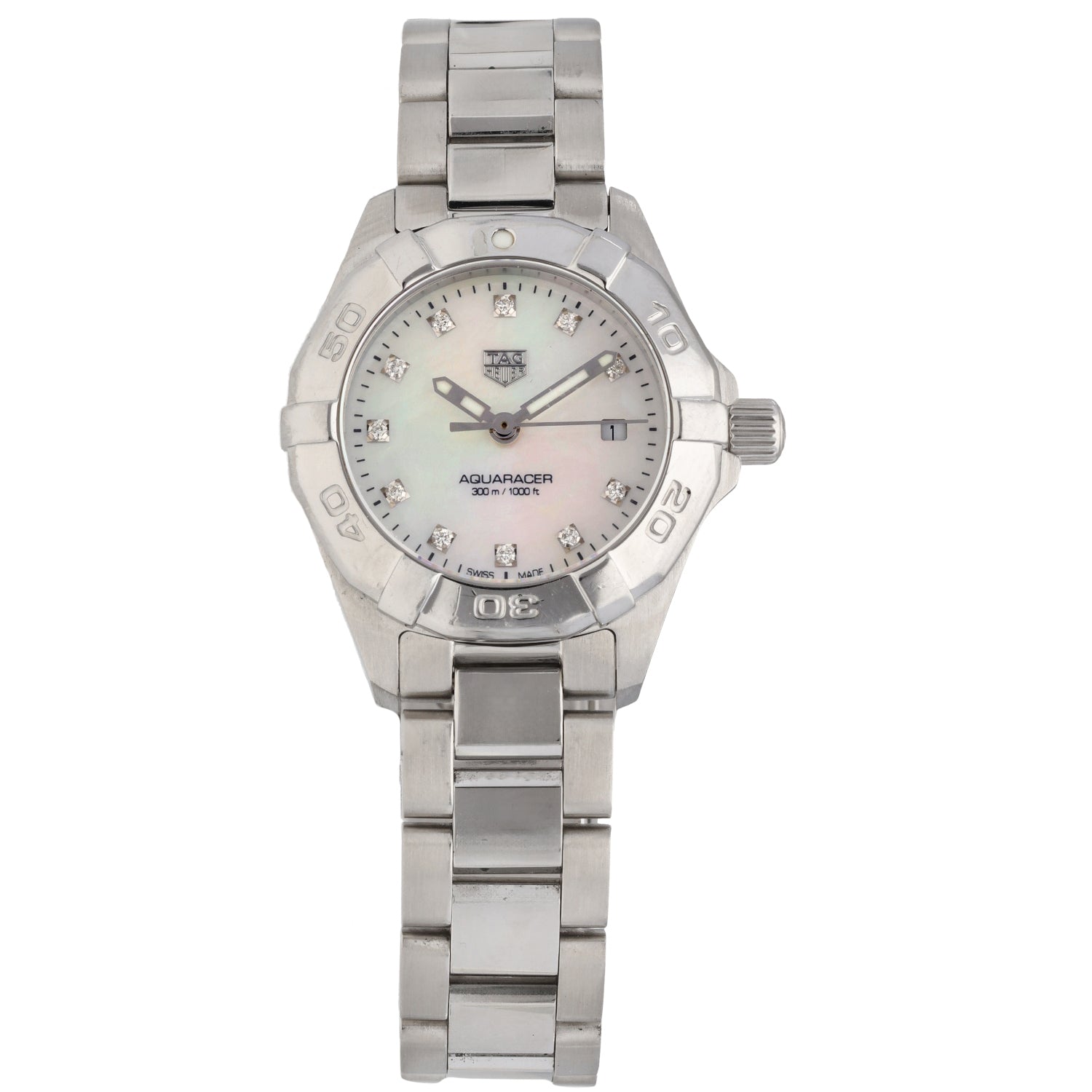 The Tag Heuer Aquaracer is an intricate timepiece which was launched by Tag Heuer back in 2004, being a perfect addition to any watch collection. This pre-owned example is finished with a white Mother of Pearl dial inside a 27mm stainless steel case, which is fitted on a 17cm stainless steel bracelet. The watch is also powered by a Quartz movement and is water resistant up to 300 metres.