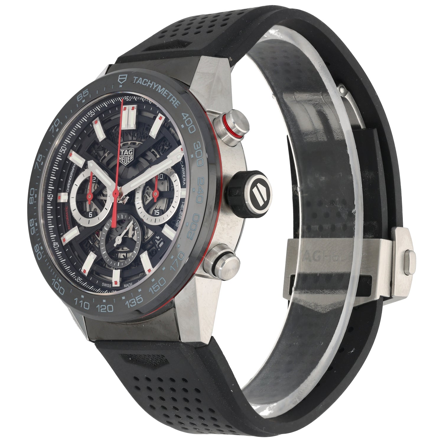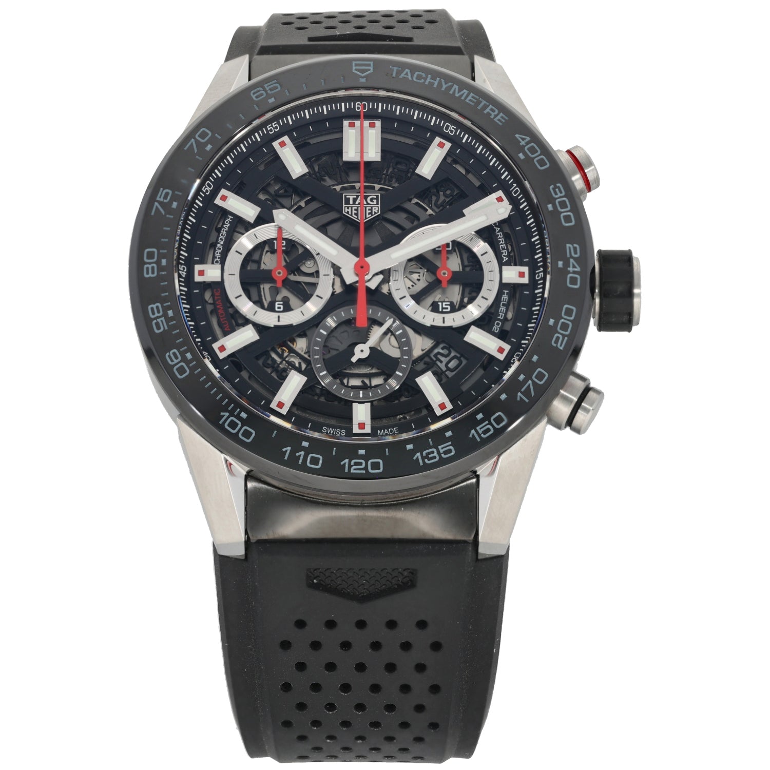 The Tag Heuer Carrera is an intricate timepiece which was launched by Tag Heuer back in 1963, being a perfect addition to any watch collection. This pre-owned example is finished with a skeleton dial inside a 45mm stainless steel case, which is fitted on an adjustable rubber...