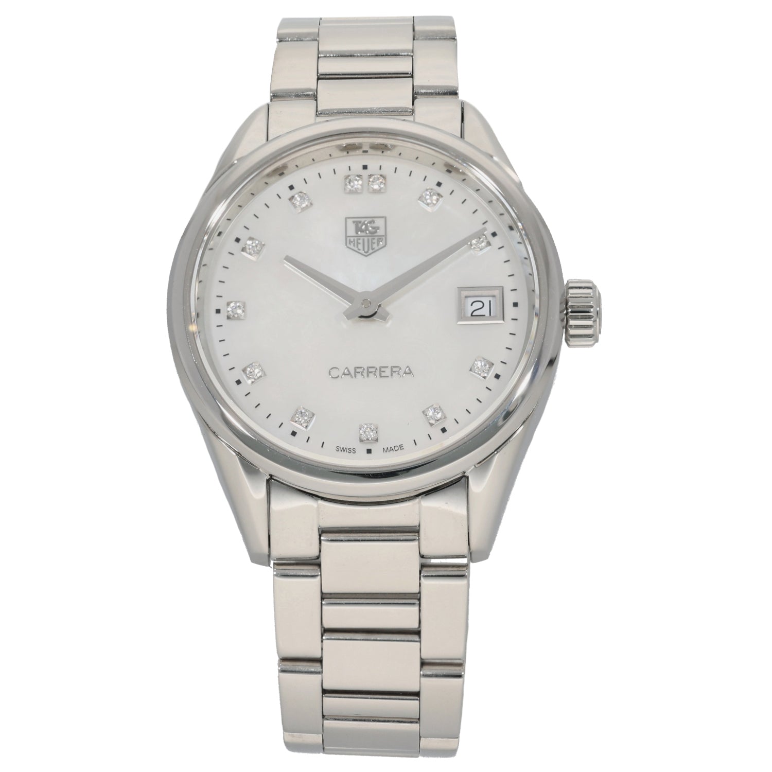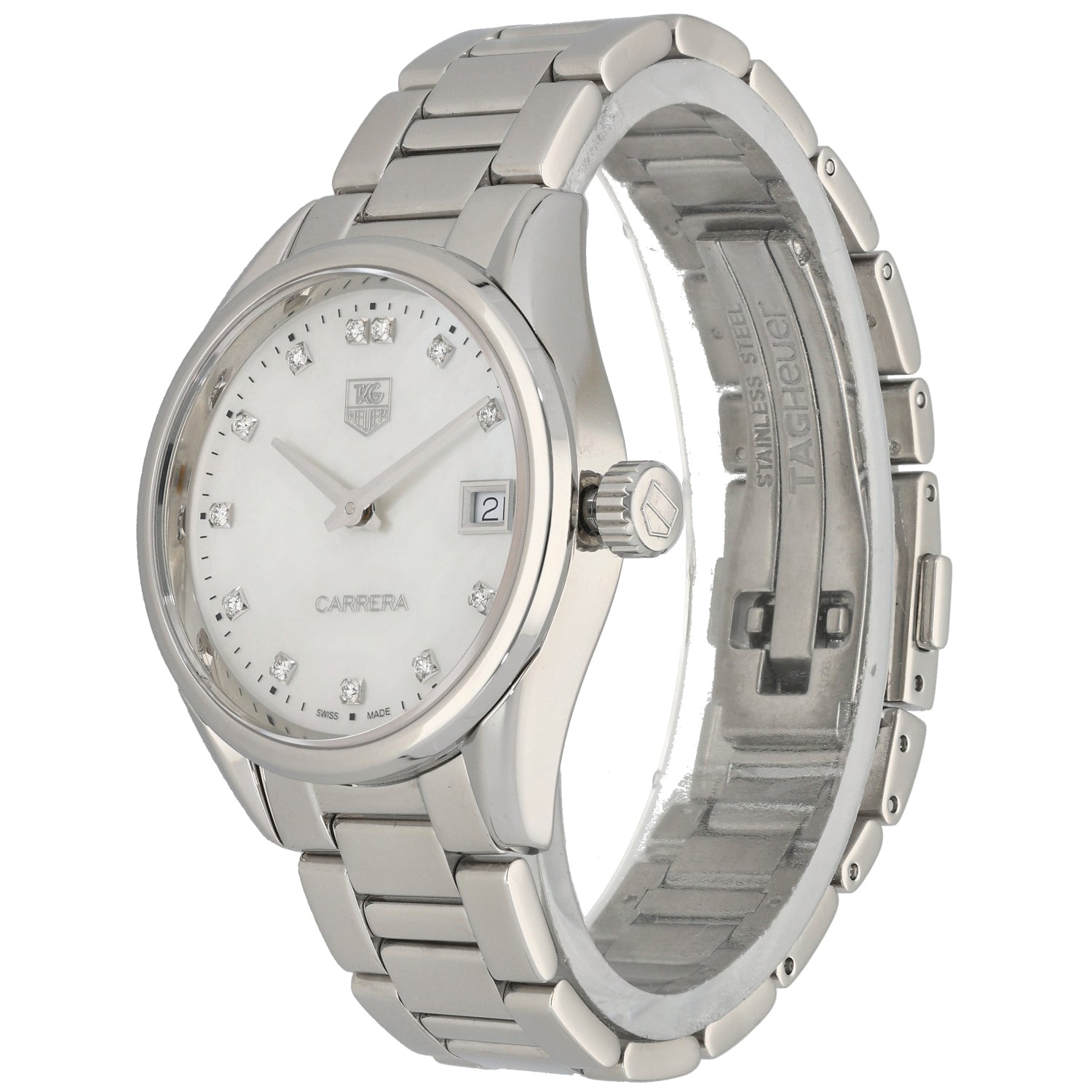 The Tag Heuer Carrera is an intricate timepiece which was launched by Tag Heuer back in 1963, being a perfect addition to any watch collection. This pre-owned example is finished with a white Mother of Pearl dial inside a 32mm stainless steel case, which is fitted on a 15.5cm stainless steel bracelet. The watch is also powered by a Quartz movement and is water resistant up to 100 metres.
