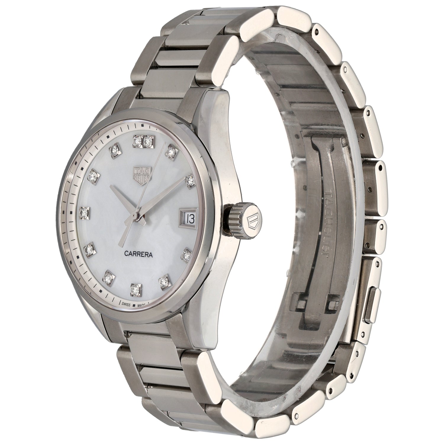 The Tag Heuer Carrera is an intricate timepiece which was launched by Tag Heuer back in 1963, being a perfect addition to any watch collection. This pre-owned example is finished with a white Mother of Pearl dial inside a 36mm stainless steel case, which is fitted on an 18cm stainless steel bracelet. The watch is also powered by a Quartz movement and is water resistant up to 100 metres.
