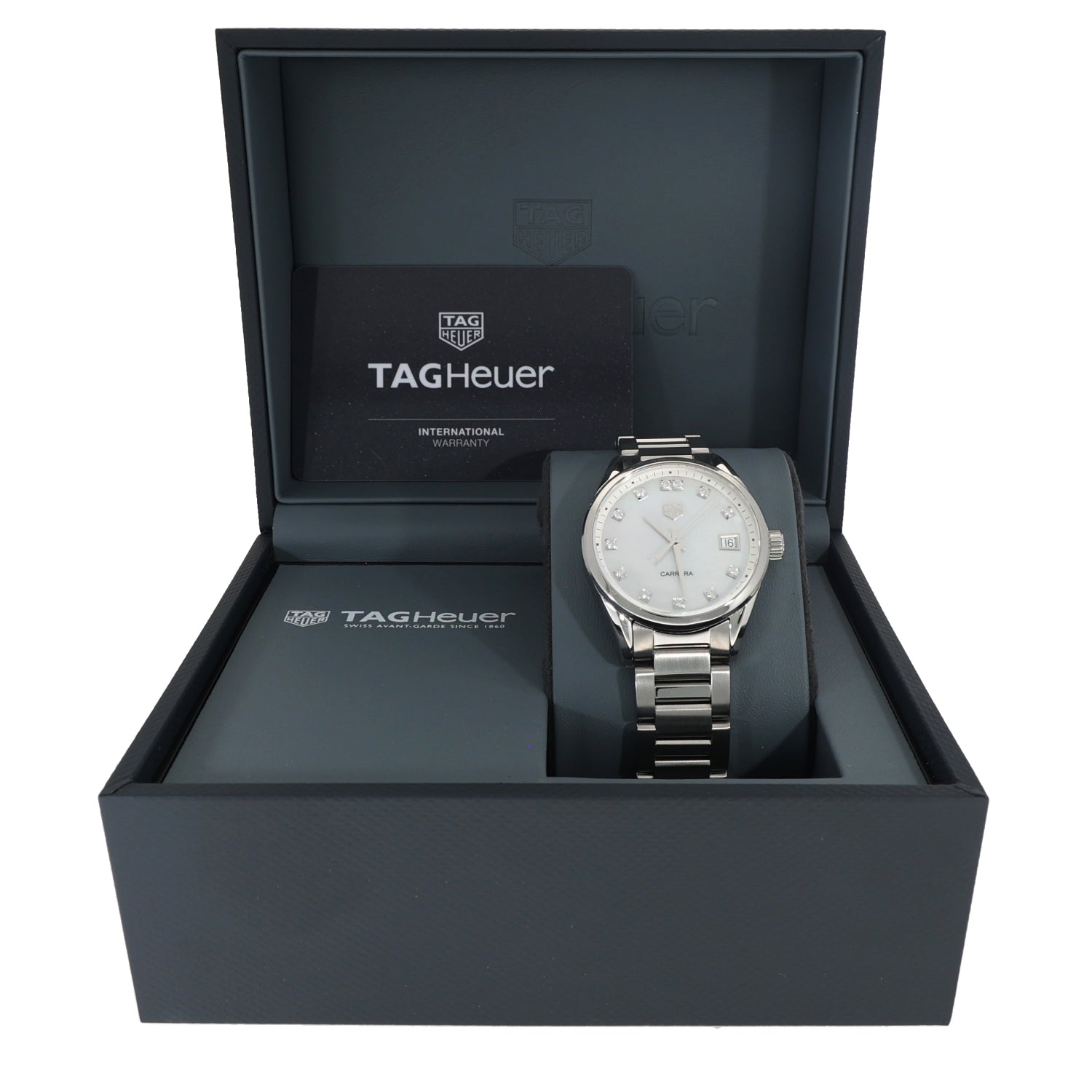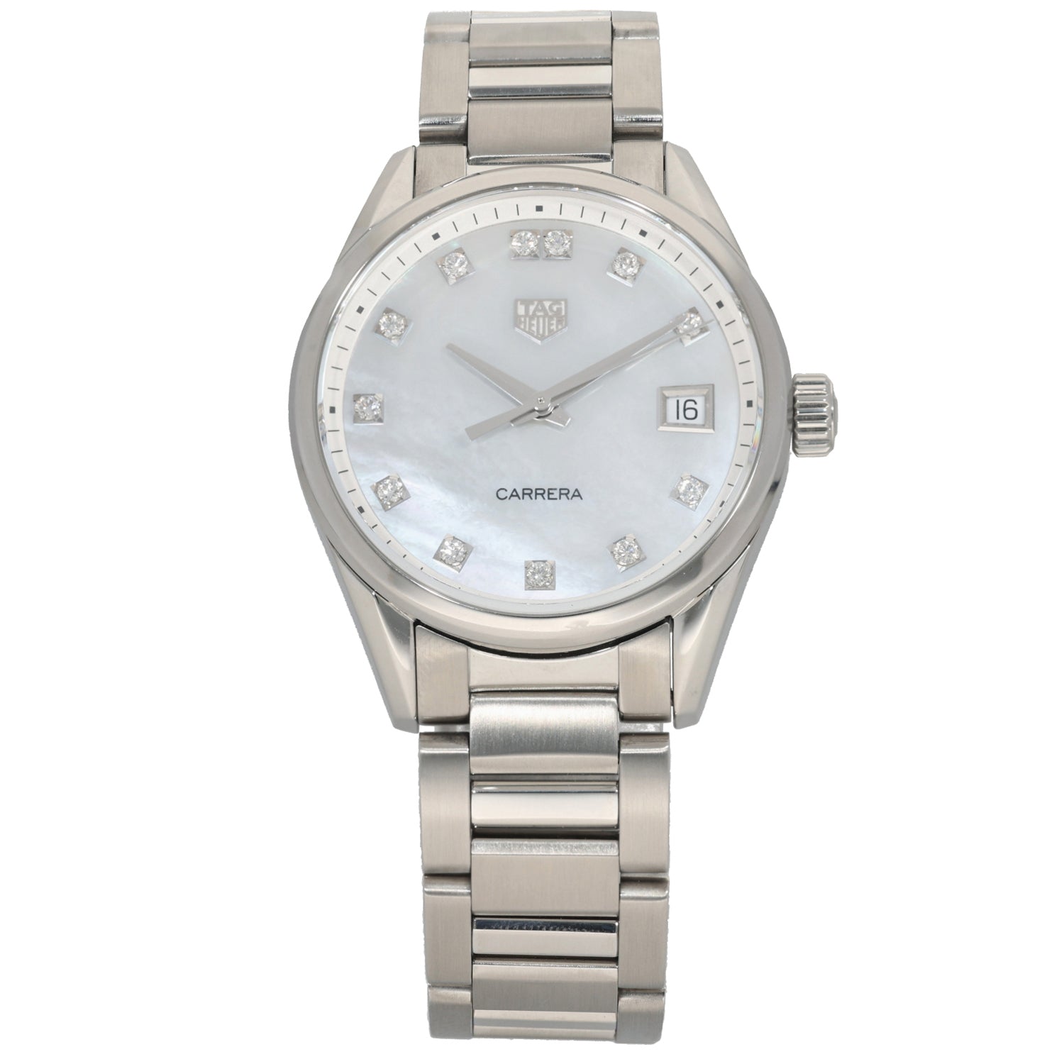 The Tag Heuer Carrera is an intricate timepiece which was launched by Tag Heuer back in 1963, being a perfect addition to any watch collection. This pre-owned example is finished with a white Mother of Pearl dial inside a 36mm stainless steel case, which is fitted on a 19cm stainless steel bracelet. The watch is also powered by a Quartz movement and is water resistant up to 50 metres.