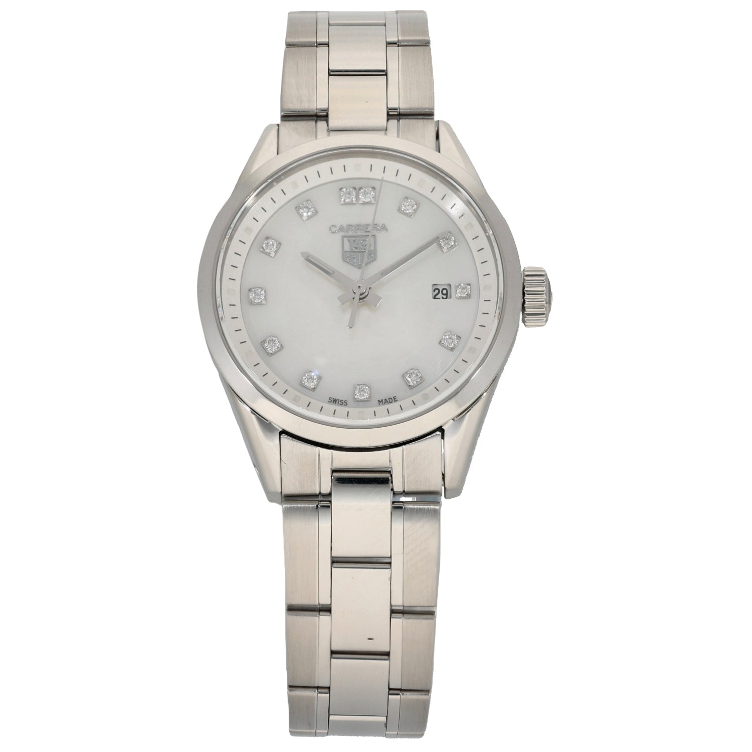The Tag Heuer Carrera is an intricate timepiece which was launched by Tag Heuer back in 1963, being a perfect addition to any watch collection. This pre-owned example is finished with a white Mother of Pearl dial inside a 27mm stainless steel case, which is fitted on a 16.5cm stainless steel bracelet. The watch is also powered by a Quartz movement and is water resistant up to 50 metres.